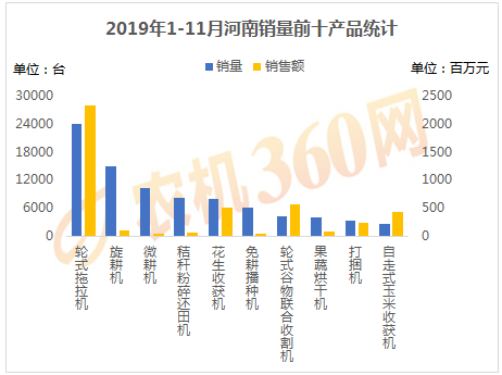 2019年1-11月,上榜河南用戶購機量前十的農(nóng)機產(chǎn)品如下圖所示,輪式拖拉機、旋耕機、微耕機等10種農(nóng)機合計購買力接近8.5萬臺,占了河南農(nóng)機總銷量的約80%,對這10類農(nóng)機的購機支出達43.3億元。