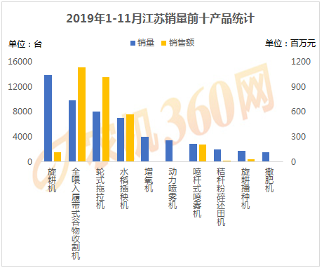 2019年1-11月,上榜江蘇用戶購機量前十的農(nóng)機產(chǎn)品如下圖所示,旋耕機、全喂入履帶式谷物收、輪式拖拉機等10種農(nóng)機合計購買力5.45萬臺,是江蘇農(nóng)機銷量的85.35%,對這10類農(nóng)機的購機支出達31.02億元。